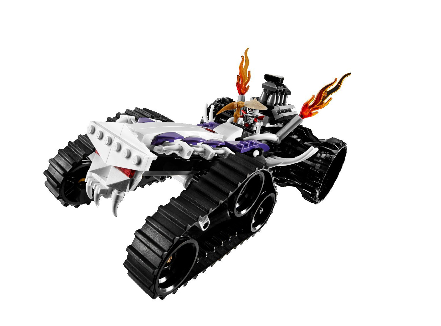 the shredder has snapping jaws, rotatable tracks, big engine and exhaust flames.